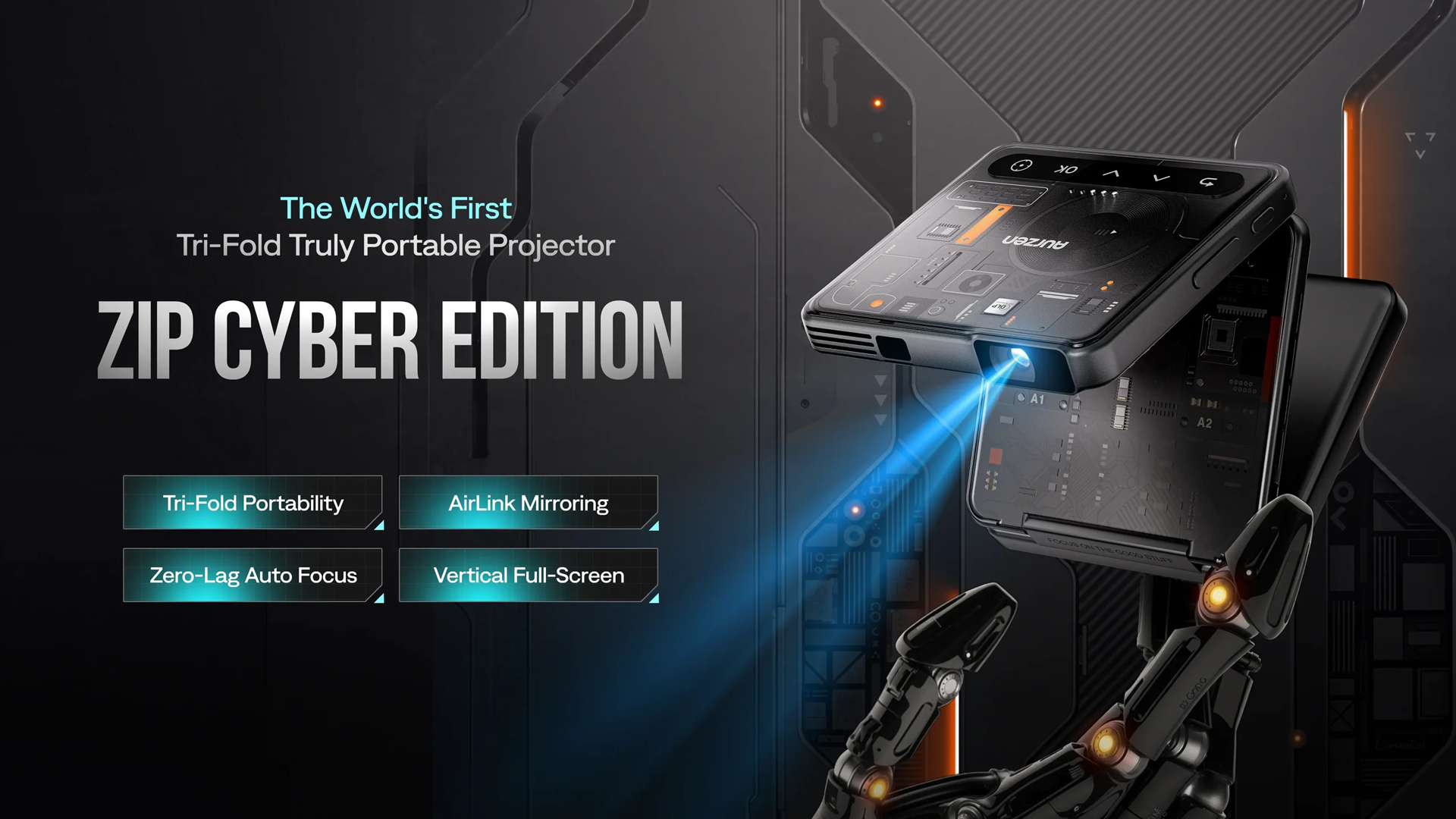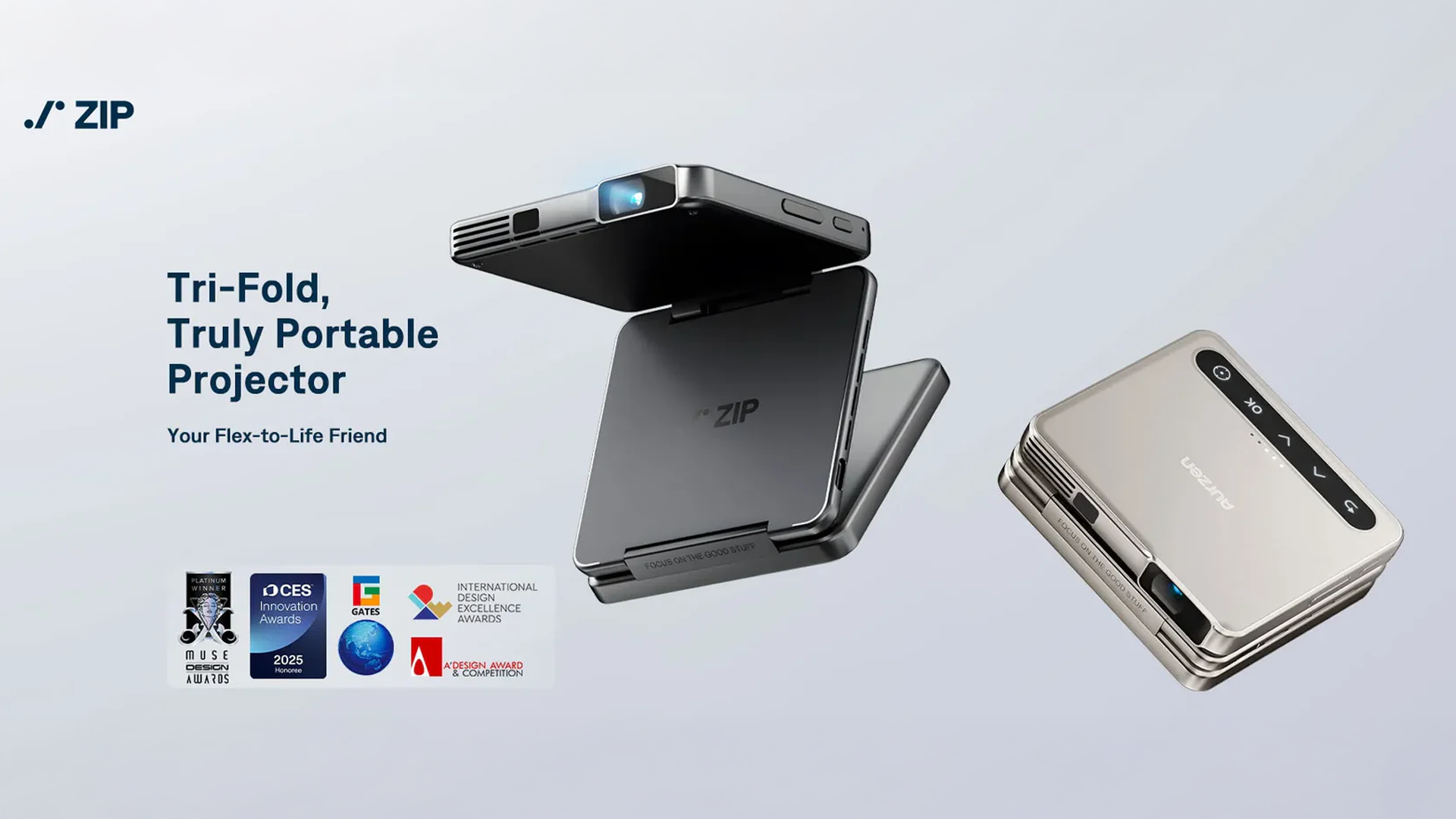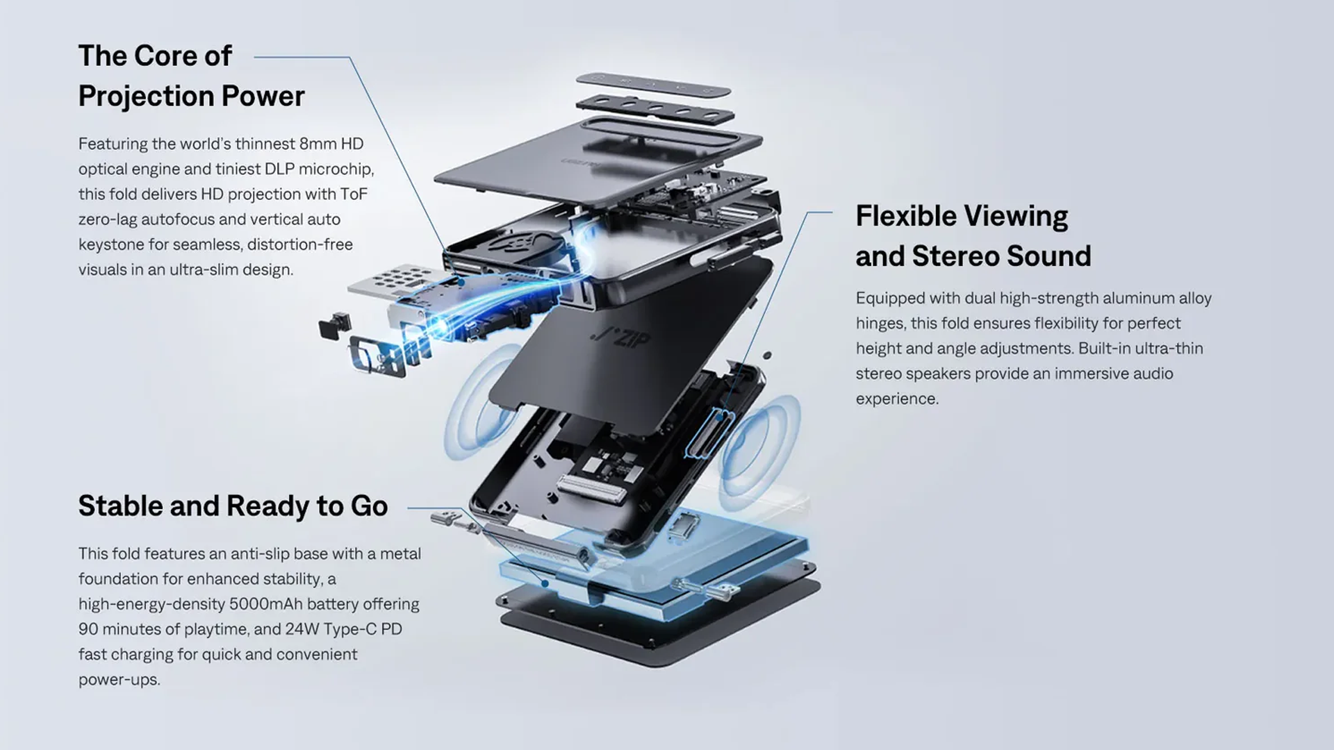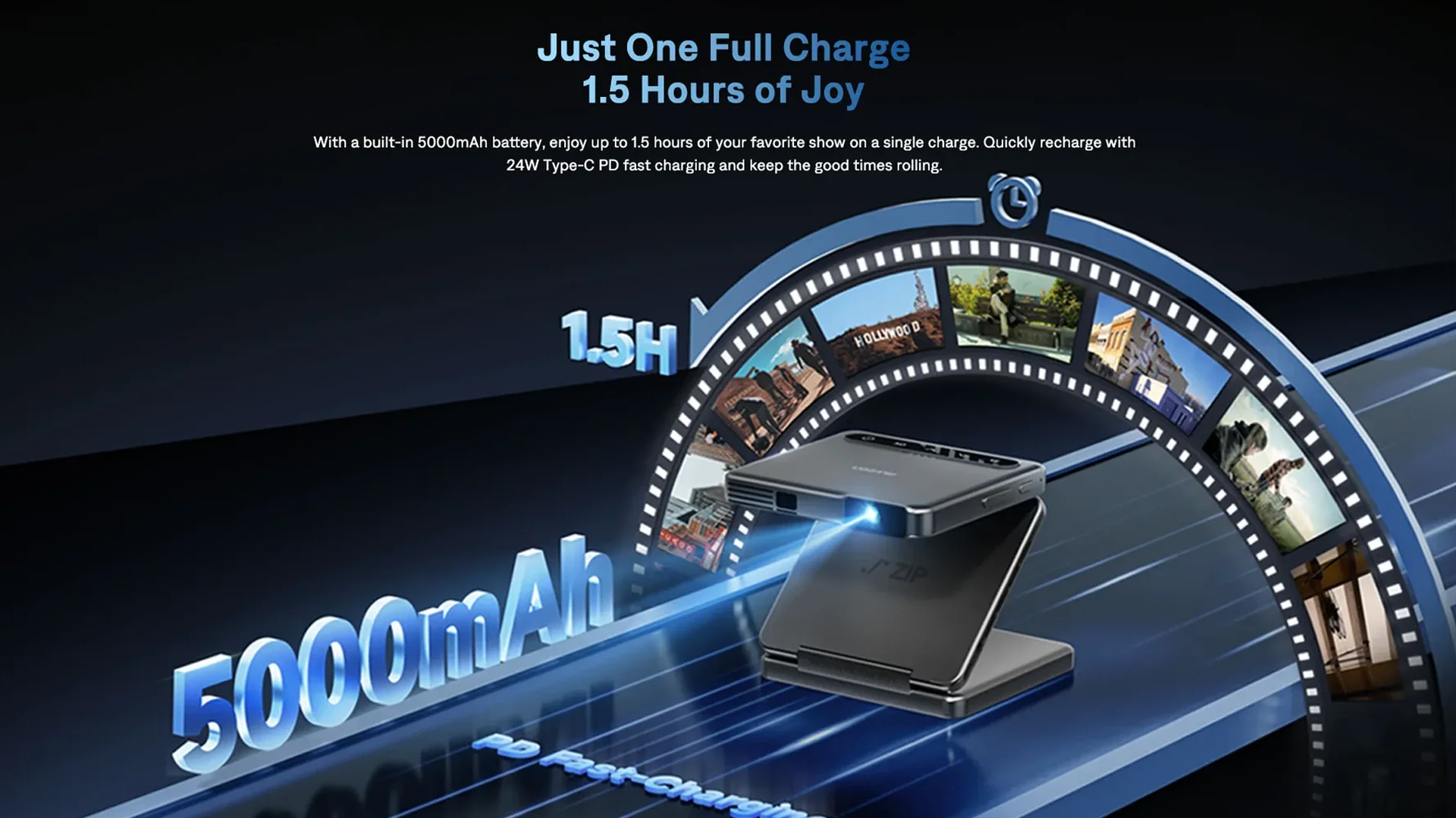 Aurzen ZIP 以革命性「 三折疊設計 」顛覆傳統,折疊後僅有手掌大小,輕鬆放入口袋,隨身攜帶。融合了世界最薄 8mm HD 光學引擎與迷你 DLP 微晶片,將 HD 投影機、內置支架、立體聲喇叭和快充電池完美結合於掌中大小。還能靈活調整角度,內建 5000mAh 電池,支援行動電源隨充隨看!單次充電可觀看長達 1.5 小時的電影。24W Type-C PD 快速充電技術讓您快速充電,持續享受美好時光。
