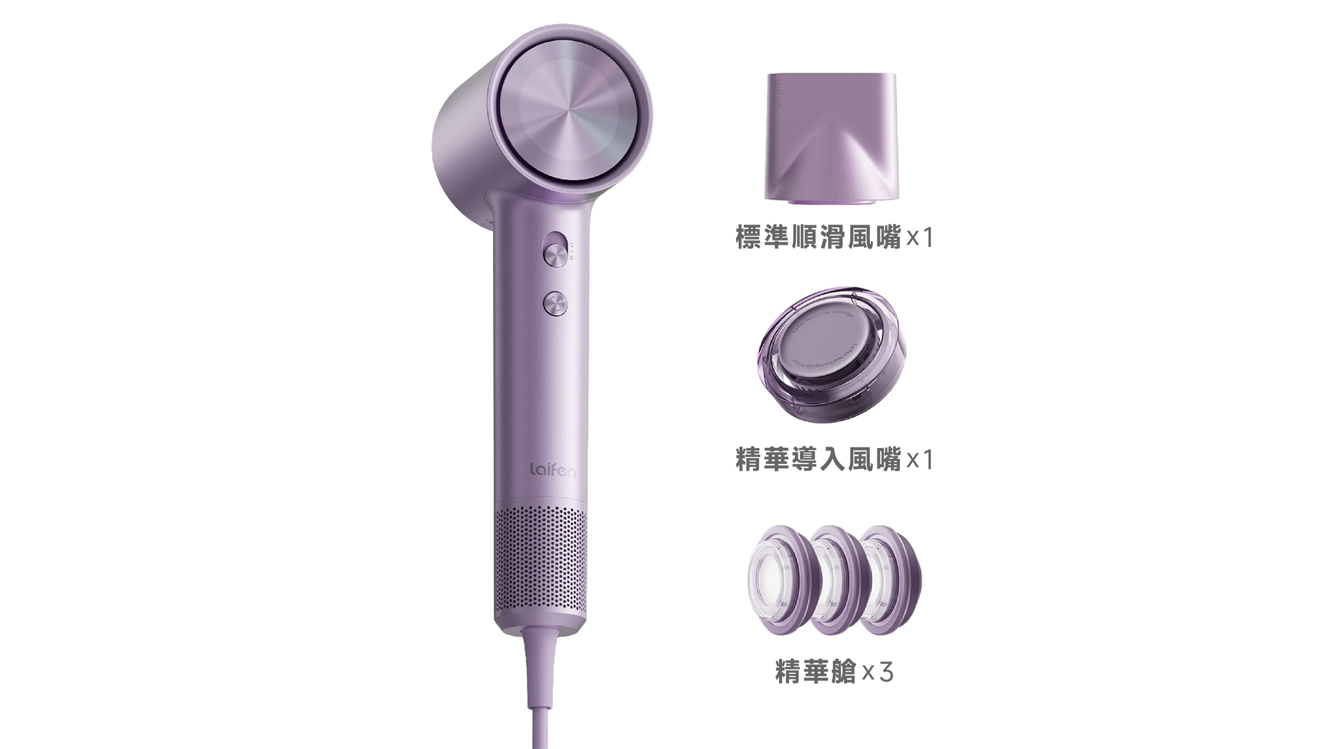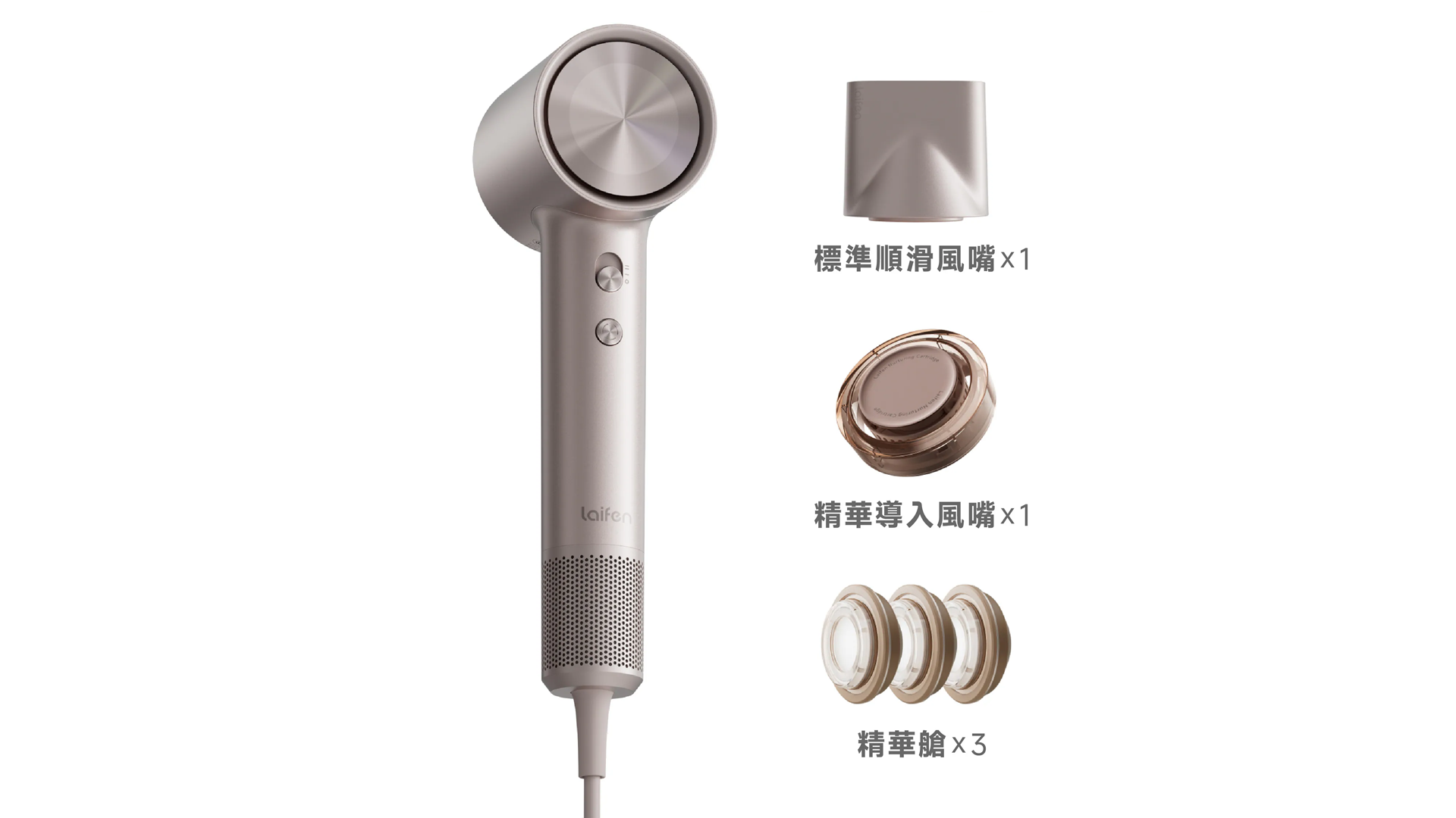 - 配件 Accessories:標準順滑風嘴x1、精華導入風嘴x1、精華艙 x3